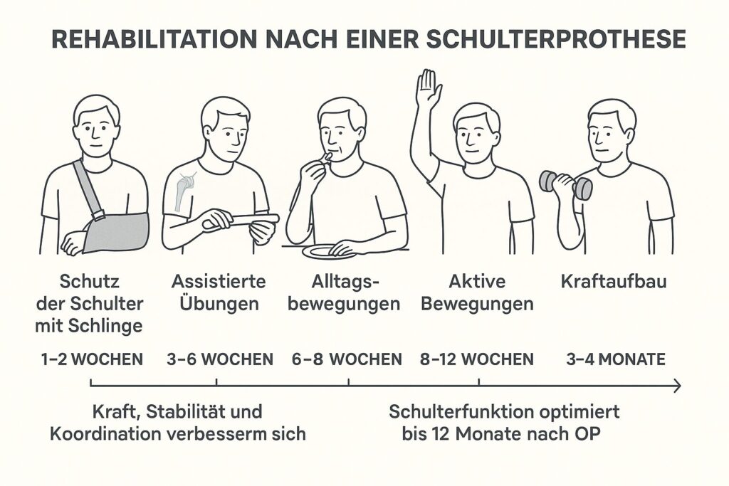Rehabilitation ist entscheidend für ein gutes Ergebnis. Die Schulter braucht Zeit, Anleitung und Geduld, um Kraft und Beweglichkeit zurückzugewinnen. Die Erholung folgt einem strukturierten Zeitplan.