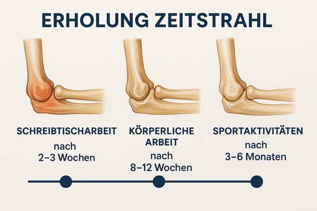 Nach der Operation wird der Arm in der Regel für einige Tage in einem weichen Verband oder einer Schiene ruhiggestellt, um die anfängliche Heilung zu ermöglichen. Leichte Schwellungen und Blutergüsse sind normal. Schmerzen werden mit oralen Medikamenten und Kühlpacks behandelt.