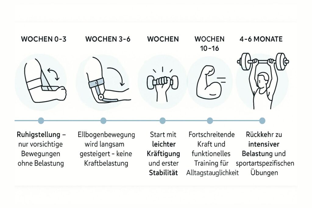 Die Heilung verläuft in mehreren Phasen. Der Arm wird zunächst geschützt gelagert und anschließend schrittweise unter physiotherapeutischer Anleitung mobilisiert, gekräftigt und schließlich wieder voll belastet.