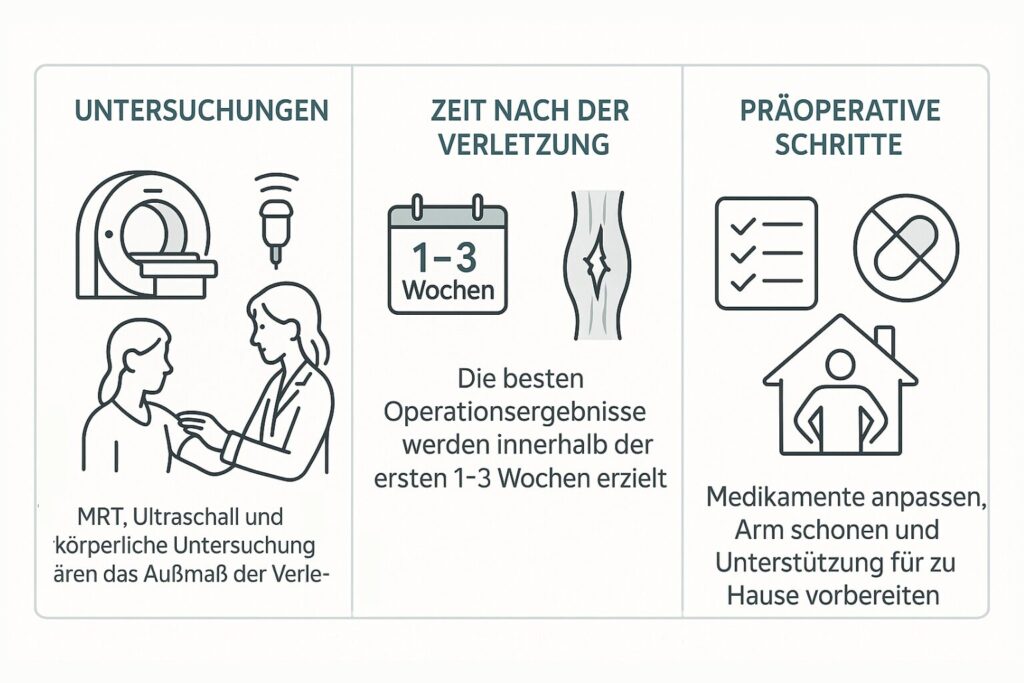 Patient:innen durchlaufen eine körperliche Untersuchung, MRT- oder Ultraschalluntersuchungen sowie routinemäßige medizinische Kontrollen wie Bluttests oder eine Narkosefreigabe. Die Chirurgin bzw. der Chirurg beurteilt dabei die Retraktion der Sehne, die Qualität des verbleibenden Gewebes und mögliche Begleitverletzungen am Ellbogen.